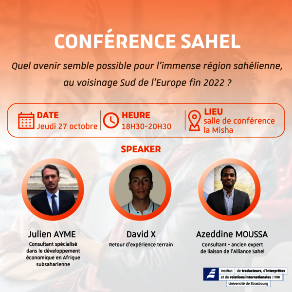 L'ITIRI a le plaisir d’accueillir Julien AYME, Azeddine MOUSSA, et David X, experts du Sahel. Ils présenteront la conférence : “Quel avenir semble possible pour l’immense région sahélienne au voisinage Sud de l’Europe fin 2022 ?”. Durant leur présentation, Ils feront un retour d’expérience terrain…